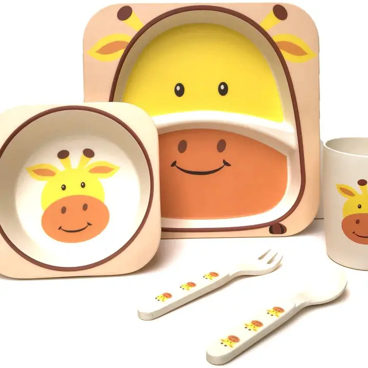 Manufactured from 100% Bamboo Fibre, biodegradable, eco-friendly, toxic-free · Set includes: Sectioned plate, bowl, cup, spoon and fork · Bamboo fibre is PVC, BPA and Phthalates free · Heat and dirt resistant and dishwasher safe · Ideal for use in or outdoors A colourful stimulating range of eco-friendly dining ware. Safe and practical helping to make mealtimes fun for your children.